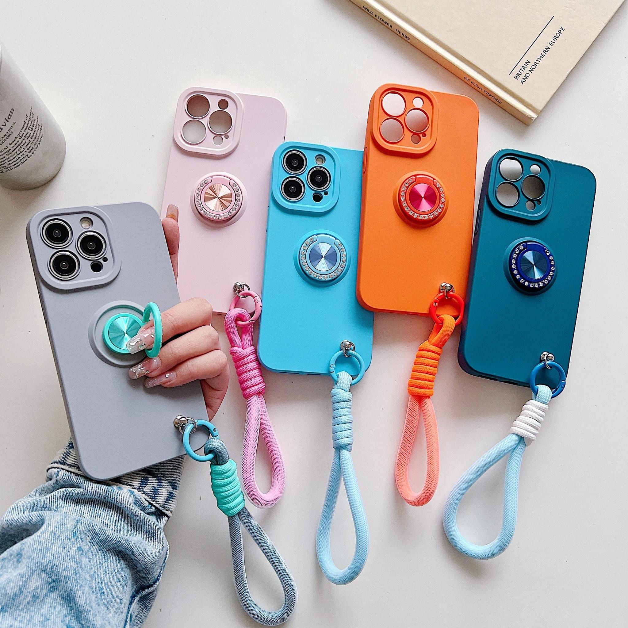 Silicona con interior de pana , sujetador correa con un anillo de soporte en el centro rodeado de strass, hacen la funda más top y linda !! Disponible para muchos modelos
